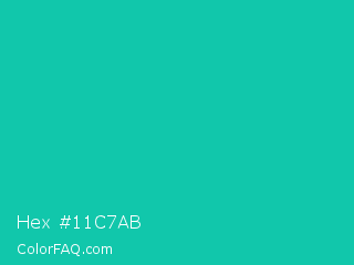 Hex #11c7ab Color is a normal cyan color and the nearest color is Tiffany Blue #0abab5. Hex code #11c7ab and RGB value is rgb(17,199,171). In RGB color space, this color is composed of 7% red, 78% green, 67% blue, In CMYK color space, this color is composed of 91% cyan, 0% magenta, 14% yellow , 22% black , In HSL color space, this color has a hue angle of 171° , 84% saturation and 42% lightness.