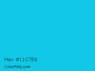 Hex #11c7e6 Color is a normal cyan color and the nearest color is Spiro Disco Ball #0fc0fc. Hex code #11c7e6 and RGB value is rgb(17,199,230). In RGB color space, this color is composed of 7% red, 78% green, 90% blue, In CMYK color space, this color is composed of 93% cyan, 13% magenta, 0% yellow , 10% black , In HSL color space, this color has a hue angle of 189° , 86% saturation and 48% lightness.