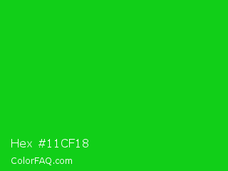 Hex #11cf18 Color is a normal green color and the nearest color is Vivid Malachite #00cc33. Hex code #11cf18 and RGB value is rgb(17,207,24). In RGB color space, this color is composed of 7% red, 81% green, 9% blue, In CMYK color space, this color is composed of 92% cyan, 0% magenta, 88% yellow , 19% black , In HSL color space, this color has a hue angle of 122° , 85% saturation and 44% lightness.