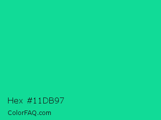 Hex #11db97 Color is a normal green color and the nearest color is Caribbean Green #00cc99. Hex code #11db97 and RGB value is rgb(17,219,151). In RGB color space, this color is composed of 7% red, 86% green, 59% blue, In CMYK color space, this color is composed of 92% cyan, 0% magenta, 31% yellow , 14% black , In HSL color space, this color has a hue angle of 160° , 86% saturation and 46% lightness.
