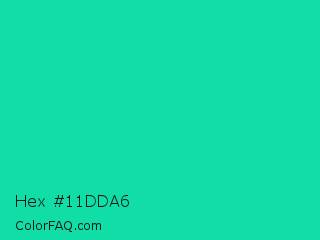 Hex #11dda6 Color is a normal cyan color and the nearest color is Caribbean Green #00cc99. Hex code #11dda6 and RGB value is rgb(17,221,166). In RGB color space, this color is composed of 7% red, 87% green, 65% blue, In CMYK color space, this color is composed of 92% cyan, 0% magenta, 25% yellow , 13% black , In HSL color space, this color has a hue angle of 164° , 86% saturation and 47% lightness.
