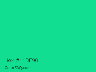 Hex #11de90 Color is a normal green color and the nearest color is Caribbean Green #00cc99. Hex code #11de90 and RGB value is rgb(17,222,144). In RGB color space, this color is composed of 7% red, 87% green, 56% blue, In CMYK color space, this color is composed of 92% cyan, 0% magenta, 35% yellow , 13% black , In HSL color space, this color has a hue angle of 157° , 86% saturation and 47% lightness.