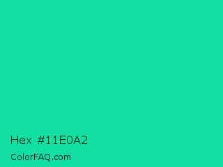 Hex #11e0a2 Color is a normal green color and the nearest color is Caribbean Green #00cc99. Hex code #11e0a2 and RGB value is rgb(17,224,162). In RGB color space, this color is composed of 7% red, 88% green, 64% blue, In CMYK color space, this color is composed of 92% cyan, 0% magenta, 28% yellow , 12% black , In HSL color space, this color has a hue angle of 162° , 86% saturation and 47% lightness.