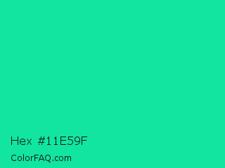 Hex #11e59f Color is a normal green color and the nearest color is Medium Spring Green #00fa9a. Hex code #11e59f and RGB value is rgb(17,229,159). In RGB color space, this color is composed of 7% red, 90% green, 62% blue, In CMYK color space, this color is composed of 93% cyan, 0% magenta, 31% yellow , 10% black , In HSL color space, this color has a hue angle of 160° , 86% saturation and 48% lightness.