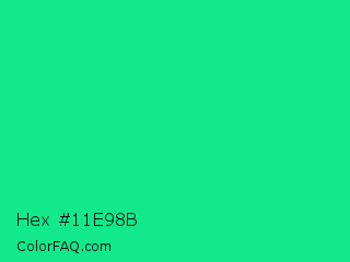 Hex #11e98b Color is a normal green color and the nearest color is Medium Spring Green #00fa9a. Hex code #11e98b and RGB value is rgb(17,233,139). In RGB color space, this color is composed of 7% red, 91% green, 55% blue, In CMYK color space, this color is composed of 93% cyan, 0% magenta, 40% yellow , 9% black , In HSL color space, this color has a hue angle of 154° , 86% saturation and 49% lightness.