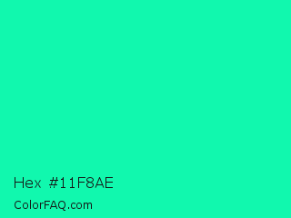 Hex #11f8ae Color is a normal green color and the nearest color is Medium Spring Green #00fa9a. Hex code #11f8ae and RGB value is rgb(17,248,174). In RGB color space, this color is composed of 7% red, 97% green, 68% blue, In CMYK color space, this color is composed of 93% cyan, 0% magenta, 30% yellow , 3% black , In HSL color space, this color has a hue angle of 161° , 94% saturation and 52% lightness.