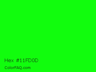 Hex #11fd0d Color is a normal green color and the nearest color is Green #00ff00. Hex code #11fd0d and RGB value is rgb(17,253,13). In RGB color space, this color is composed of 7% red, 99% green, 5% blue, In CMYK color space, this color is composed of 93% cyan, 0% magenta, 95% yellow , 1% black , In HSL color space, this color has a hue angle of 119° , 98% saturation and 52% lightness.