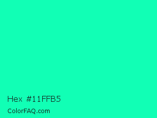 Hex #11ffb5 Color is a normal green color and the nearest color is Medium Spring Green #00fa9a. Hex code #11ffb5 and RGB value is rgb(17,255,181). In RGB color space, this color is composed of 7% red, 100% green, 71% blue, In CMYK color space, this color is composed of 93% cyan, 0% magenta, 29% yellow , 0% black , In HSL color space, this color has a hue angle of 161° , 100% saturation and 53% lightness.