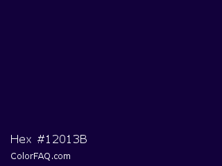 Hex #12013b Color is a very dark indigo color and the nearest color is Black Rock #0d0332. Hex code #12013b and RGB value is rgb(18,1,59). In RGB color space, this color is composed of 7% red, 0% green, 23% blue, In CMYK color space, this color is composed of 69% cyan, 98% magenta, 0% yellow , 77% black , In HSL color space, this color has a hue angle of 258° , 97% saturation and 12% lightness.
