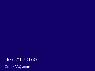 Hex #120168 Color is a very dark indigo color and the nearest color is Arapawa #110c6c. Hex code #120168 and RGB value is rgb(18,1,104). In RGB color space, this color is composed of 7% red, 0% green, 41% blue, In CMYK color space, this color is composed of 83% cyan, 99% magenta, 0% yellow , 59% black , In HSL color space, this color has a hue angle of 250° , 98% saturation and 21% lightness.