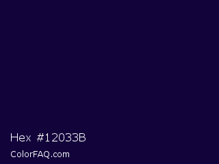 Hex #12033b Color is a very dark indigo color and the nearest color is Black Rock #0d0332. Hex code #12033b and RGB value is rgb(18,3,59). In RGB color space, this color is composed of 7% red, 1% green, 23% blue, In CMYK color space, this color is composed of 69% cyan, 95% magenta, 0% yellow , 77% black , In HSL color space, this color has a hue angle of 256° , 90% saturation and 12% lightness.