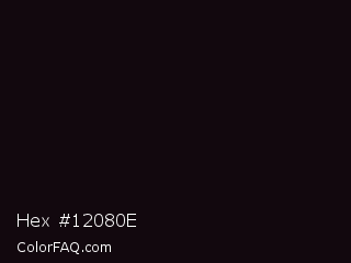 Hex #12080e Color is a almost black magenta color and the nearest color is Smoky Black #100c08. Hex code #12080e and RGB value is rgb(18,8,14). In RGB color space, this color is composed of 7% red, 3% green, 5% blue, In CMYK color space, this color is composed of 0% cyan, 56% magenta, 22% yellow , 93% black , In HSL color space, this color has a hue angle of 324° , 38% saturation and 5% lightness.