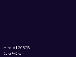 Hex #12082b Color is a very dark indigo color and the nearest color is Black Rock #0d0332. Hex code #12082b and RGB value is rgb(18,8,43). In RGB color space, this color is composed of 7% red, 3% green, 17% blue, In CMYK color space, this color is composed of 58% cyan, 81% magenta, 0% yellow , 83% black , In HSL color space, this color has a hue angle of 257° , 69% saturation and 10% lightness.