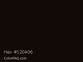 Hex #120a06 Color is a almost black orange color and the nearest color is Asphalt #130a06. Hex code #120a06 and RGB value is rgb(18,10,6). In RGB color space, this color is composed of 7% red, 4% green, 2% blue, In CMYK color space, this color is composed of 0% cyan, 44% magenta, 67% yellow , 93% black , In HSL color space, this color has a hue angle of 20° , 50% saturation and 5% lightness.