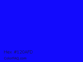 Hex #120afd Color is a normal indigo color and the nearest color is Blue #0000ff. Hex code #120afd and RGB value is rgb(18,10,253). In RGB color space, this color is composed of 7% red, 4% green, 99% blue, In CMYK color space, this color is composed of 93% cyan, 96% magenta, 0% yellow , 1% black , In HSL color space, this color has a hue angle of 242° , 98% saturation and 52% lightness.