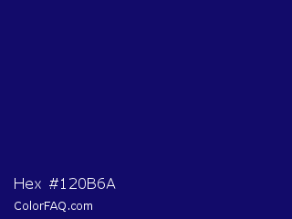 Hex #120b6a Color is a dark indigo color and the nearest color is Arapawa #110c6c. Hex code #120b6a and RGB value is rgb(18,11,106). In RGB color space, this color is composed of 7% red, 4% green, 42% blue, In CMYK color space, this color is composed of 83% cyan, 90% magenta, 0% yellow , 58% black , In HSL color space, this color has a hue angle of 244° , 81% saturation and 23% lightness.