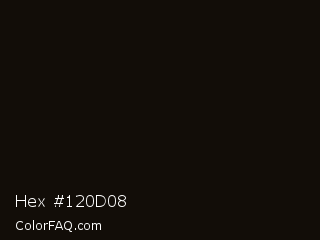 Hex #120d08 Color is a almost black orange color and the nearest color is Smoky Black #100c08. Hex code #120d08 and RGB value is rgb(18,13,8). In RGB color space, this color is composed of 7% red, 5% green, 3% blue, In CMYK color space, this color is composed of 0% cyan, 28% magenta, 56% yellow , 93% black , In HSL color space, this color has a hue angle of 30° , 38% saturation and 5% lightness.