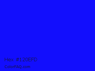 Hex #120efd Color is a normal indigo color and the nearest color is Bluebonnet #1c1cf0. Hex code #120efd and RGB value is rgb(18,14,253). In RGB color space, this color is composed of 7% red, 5% green, 99% blue, In CMYK color space, this color is composed of 93% cyan, 94% magenta, 0% yellow , 1% black , In HSL color space, this color has a hue angle of 241° , 98% saturation and 52% lightness.