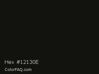 Hex #12130e Color is a almost black lime color and the nearest color is Licorice #1a1110. Hex code #12130e and RGB value is rgb(18,19,14). In RGB color space, this color is composed of 7% red, 7% green, 5% blue, In CMYK color space, this color is composed of 5% cyan, 0% magenta, 26% yellow , 93% black , In HSL color space, this color has a hue angle of 72° , 15% saturation and 6% lightness.