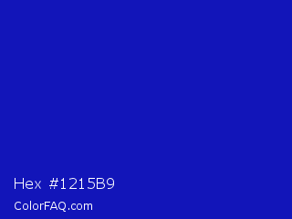 Hex #1215b9 Color is a normal blue color and the nearest color is Zaffre #0014a8. Hex code #1215b9 and RGB value is rgb(18,21,185). In RGB color space, this color is composed of 7% red, 8% green, 73% blue, In CMYK color space, this color is composed of 90% cyan, 89% magenta, 0% yellow , 27% black , In HSL color space, this color has a hue angle of 239° , 82% saturation and 40% lightness.