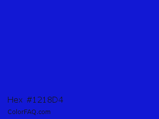 Hex #1218d4 Color is a normal blue color and the nearest color is Bluebonnet #1c1cf0. Hex code #1218d4 and RGB value is rgb(18,24,212). In RGB color space, this color is composed of 7% red, 9% green, 83% blue, In CMYK color space, this color is composed of 92% cyan, 89% magenta, 0% yellow , 17% black , In HSL color space, this color has a hue angle of 238° , 84% saturation and 45% lightness.