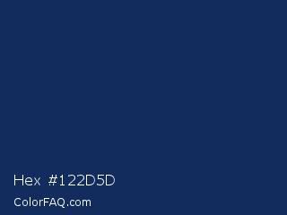 Hex #122d5d Color is a very dark blue color and the nearest color is Biscay #1b3162. Hex code #122d5d and RGB value is rgb(18,45,93). In RGB color space, this color is composed of 7% red, 18% green, 36% blue, In CMYK color space, this color is composed of 81% cyan, 52% magenta, 0% yellow , 64% black , In HSL color space, this color has a hue angle of 218° , 68% saturation and 22% lightness.