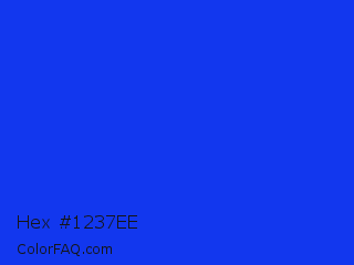 Hex #1237ee Color is a normal blue color and the nearest color is Palatinate Blue #273be2. Hex code #1237ee and RGB value is rgb(18,55,238). In RGB color space, this color is composed of 7% red, 22% green, 93% blue, In CMYK color space, this color is composed of 92% cyan, 77% magenta, 0% yellow , 7% black , In HSL color space, this color has a hue angle of 230° , 87% saturation and 50% lightness.