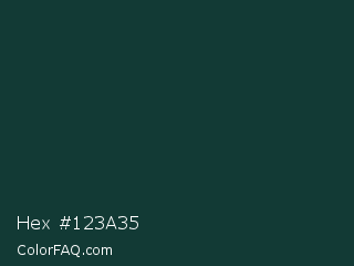 Hex #123a35 Color is a very dark cyan color and the nearest color is Gable Green #163531. Hex code #123a35 and RGB value is rgb(18,58,53). In RGB color space, this color is composed of 7% red, 23% green, 21% blue, In CMYK color space, this color is composed of 69% cyan, 0% magenta, 9% yellow , 77% black , In HSL color space, this color has a hue angle of 173° , 53% saturation and 15% lightness.