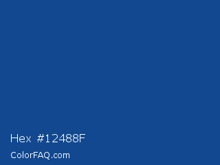 Hex #12488f Color is a normal blue color and the nearest color is Yale Blue #0f4d92. Hex code #12488f and RGB value is rgb(18,72,143). In RGB color space, this color is composed of 7% red, 28% green, 56% blue, In CMYK color space, this color is composed of 87% cyan, 50% magenta, 0% yellow , 44% black , In HSL color space, this color has a hue angle of 214° , 78% saturation and 32% lightness.
