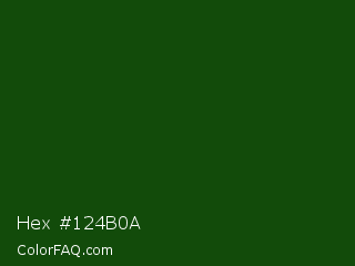 Hex #124b0a Color is a very dark green color and the nearest color is Dark Fern #0a480d. Hex code #124b0a and RGB value is rgb(18,75,10). In RGB color space, this color is composed of 7% red, 29% green, 4% blue, In CMYK color space, this color is composed of 76% cyan, 0% magenta, 87% yellow , 71% black , In HSL color space, this color has a hue angle of 113° , 76% saturation and 17% lightness.