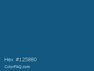 Hex #125880 Color is a dark blue color and the nearest color is Blumine #18587a. Hex code #125880 and RGB value is rgb(18,88,128). In RGB color space, this color is composed of 7% red, 35% green, 50% blue, In CMYK color space, this color is composed of 86% cyan, 31% magenta, 0% yellow , 50% black , In HSL color space, this color has a hue angle of 202° , 75% saturation and 29% lightness.