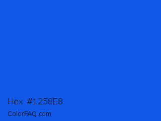 Hex #1258e8 Color is a normal blue color and the nearest color is Blue RYB #0247fe. Hex code #1258e8 and RGB value is rgb(18,88,232). In RGB color space, this color is composed of 7% red, 35% green, 91% blue, In CMYK color space, this color is composed of 92% cyan, 62% magenta, 0% yellow , 9% black , In HSL color space, this color has a hue angle of 220° , 86% saturation and 49% lightness.