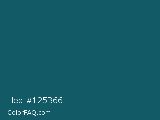 Hex #125b66 Color is a dark cyan color and the nearest color is Deep Sea Green #095859. Hex code #125b66 and RGB value is rgb(18,91,102). In RGB color space, this color is composed of 7% red, 36% green, 40% blue, In CMYK color space, this color is composed of 82% cyan, 11% magenta, 0% yellow , 60% black , In HSL color space, this color has a hue angle of 188° , 70% saturation and 24% lightness.