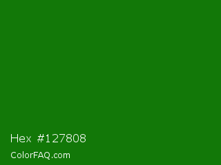 Hex #127808 Color is a dark green color and the nearest color is India Green #138808. Hex code #127808 and RGB value is rgb(18,120,8). In RGB color space, this color is composed of 7% red, 47% green, 3% blue, In CMYK color space, this color is composed of 85% cyan, 0% magenta, 93% yellow , 53% black , In HSL color space, this color has a hue angle of 115° , 88% saturation and 25% lightness.