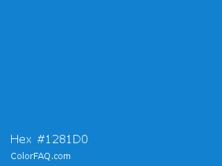 Hex #1281d0 Color is a normal blue color and the nearest color is Bright Navy Blue #1974d2. Hex code #1281d0 and RGB value is rgb(18,129,208). In RGB color space, this color is composed of 7% red, 51% green, 82% blue, In CMYK color space, this color is composed of 91% cyan, 38% magenta, 0% yellow , 18% black , In HSL color space, this color has a hue angle of 205° , 84% saturation and 44% lightness.