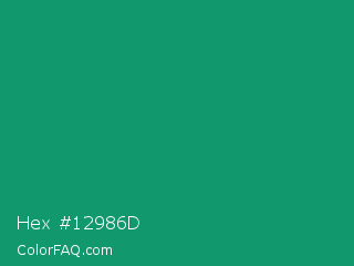 Hex #12986d Color is a normal green color and the nearest color is Green Cyan #009966. Hex code #12986d and RGB value is rgb(18,152,109). In RGB color space, this color is composed of 7% red, 60% green, 43% blue, In CMYK color space, this color is composed of 88% cyan, 0% magenta, 28% yellow , 40% black , In HSL color space, this color has a hue angle of 161° , 79% saturation and 33% lightness.