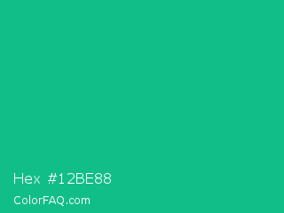 Hex #12be88 Color is a normal green color and the nearest color is Mountain Meadow Crayola #1ab385. Hex code #12be88 and RGB value is rgb(18,190,136). In RGB color space, this color is composed of 7% red, 75% green, 53% blue, In CMYK color space, this color is composed of 91% cyan, 0% magenta, 28% yellow , 25% black , In HSL color space, this color has a hue angle of 161° , 83% saturation and 41% lightness.