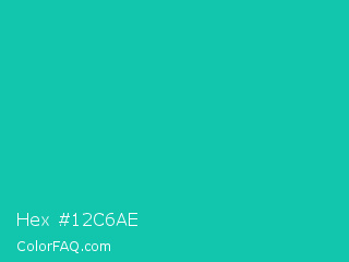 Hex #12c6ae Color is a normal cyan color and the nearest color is Tiffany Blue #0abab5. Hex code #12c6ae and RGB value is rgb(18,198,174). In RGB color space, this color is composed of 7% red, 78% green, 68% blue, In CMYK color space, this color is composed of 91% cyan, 0% magenta, 12% yellow , 22% black , In HSL color space, this color has a hue angle of 172° , 83% saturation and 42% lightness.