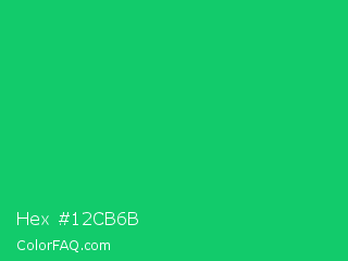Hex #12cb6b Color is a normal green color and the nearest color is Malachite #0bda51. Hex code #12cb6b and RGB value is rgb(18,203,107). In RGB color space, this color is composed of 7% red, 80% green, 42% blue, In CMYK color space, this color is composed of 91% cyan, 0% magenta, 47% yellow , 20% black , In HSL color space, this color has a hue angle of 149° , 84% saturation and 43% lightness.