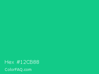 Hex #12cb88 Color is a normal green color and the nearest color is Caribbean Green #00cc99. Hex code #12cb88 and RGB value is rgb(18,203,136). In RGB color space, this color is composed of 7% red, 80% green, 53% blue, In CMYK color space, this color is composed of 91% cyan, 0% magenta, 33% yellow , 20% black , In HSL color space, this color has a hue angle of 158° , 84% saturation and 43% lightness.