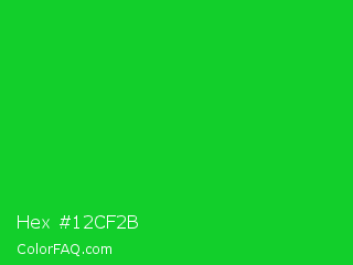 Hex #12cf2b Color is a normal green color and the nearest color is Vivid Malachite #00cc33. Hex code #12cf2b and RGB value is rgb(18,207,43). In RGB color space, this color is composed of 7% red, 81% green, 17% blue, In CMYK color space, this color is composed of 91% cyan, 0% magenta, 79% yellow , 19% black , In HSL color space, this color has a hue angle of 128° , 84% saturation and 44% lightness.