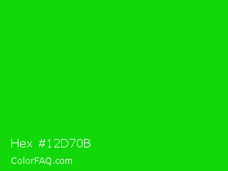 Hex #12d70b Color is a normal green color and the nearest color is Vivid Malachite #00cc33. Hex code #12d70b and RGB value is rgb(18,215,11). In RGB color space, this color is composed of 7% red, 84% green, 4% blue, In CMYK color space, this color is composed of 92% cyan, 0% magenta, 95% yellow , 16% black , In HSL color space, this color has a hue angle of 118° , 90% saturation and 44% lightness.