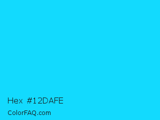 Hex #12dafe Color is a normal cyan color and the nearest color is Vivid Sky Blue #00ccff. Hex code #12dafe and RGB value is rgb(18,218,254). In RGB color space, this color is composed of 7% red, 85% green, 100% blue, In CMYK color space, this color is composed of 93% cyan, 14% magenta, 0% yellow , 0% black , In HSL color space, this color has a hue angle of 189° , 99% saturation and 53% lightness.