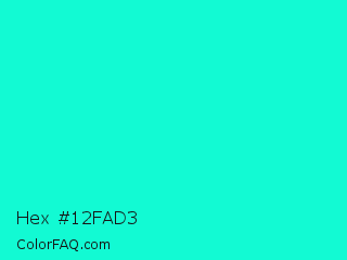Hex #12fad3 Color is a normal cyan color and the nearest color is Bright Turquoise #08e8de. Hex code #12fad3 and RGB value is rgb(18,250,211). In RGB color space, this color is composed of 7% red, 98% green, 83% blue, In CMYK color space, this color is composed of 93% cyan, 0% magenta, 16% yellow , 2% black , In HSL color space, this color has a hue angle of 170° , 96% saturation and 53% lightness.