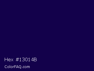 Hex #13014b Color is a very dark indigo color and the nearest color is Tolopea #1b0245. Hex code #13014b and RGB value is rgb(19,1,75). In RGB color space, this color is composed of 7% red, 0% green, 29% blue, In CMYK color space, this color is composed of 75% cyan, 99% magenta, 0% yellow , 71% black , In HSL color space, this color has a hue angle of 255° , 97% saturation and 15% lightness.