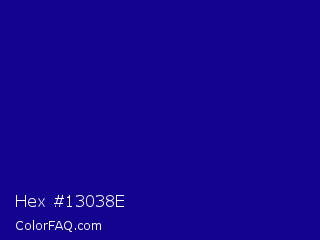 Hex #13038e Color is a dark indigo color and the nearest color is Ultramarine #120a8f. Hex code #13038e and RGB value is rgb(19,3,142). In RGB color space, this color is composed of 7% red, 1% green, 56% blue, In CMYK color space, this color is composed of 87% cyan, 98% magenta, 0% yellow , 44% black , In HSL color space, this color has a hue angle of 247° , 96% saturation and 28% lightness.