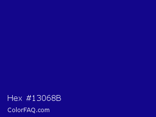 Hex #13068b Color is a dark indigo color and the nearest color is Ultramarine #120a8f. Hex code #13068b and RGB value is rgb(19,6,139). In RGB color space, this color is composed of 7% red, 2% green, 55% blue, In CMYK color space, this color is composed of 86% cyan, 96% magenta, 0% yellow , 45% black , In HSL color space, this color has a hue angle of 246° , 92% saturation and 28% lightness.