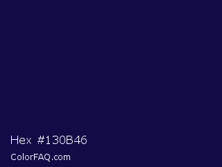 Hex #130b46 Color is a very dark indigo color and the nearest color is Tolopea #1b0245. Hex code #130b46 and RGB value is rgb(19,11,70). In RGB color space, this color is composed of 7% red, 4% green, 27% blue, In CMYK color space, this color is composed of 73% cyan, 84% magenta, 0% yellow , 73% black , In HSL color space, this color has a hue angle of 248° , 73% saturation and 16% lightness.
