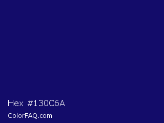 Hex #130c6a Color is a dark indigo color and the nearest color is Arapawa #110c6c. Hex code #130c6a and RGB value is rgb(19,12,106). In RGB color space, this color is composed of 7% red, 5% green, 42% blue, In CMYK color space, this color is composed of 82% cyan, 89% magenta, 0% yellow , 58% black , In HSL color space, this color has a hue angle of 244° , 80% saturation and 23% lightness.