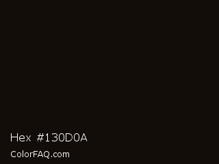 Hex #130d0a Color is a almost black orange color and the nearest color is Smoky Black #100c08. Hex code #130d0a and RGB value is rgb(19,13,10). In RGB color space, this color is composed of 7% red, 5% green, 4% blue, In CMYK color space, this color is composed of 0% cyan, 32% magenta, 47% yellow , 93% black , In HSL color space, this color has a hue angle of 20° , 31% saturation and 6% lightness.